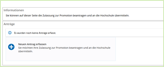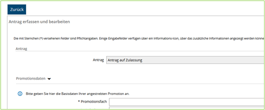 4. Der Antrag wird nun angezeigt. Bitte füllen Sie alle erforderlichen Felder sorgfältig aus. Sobald Sie alle Angaben überprüft und vollständig eingetragen haben, können Sie den Antrag abschicken. Der Antrag wird dann an den Promotionsauschuss Ihrer Fakultät zur Überprüfung weitergeleitet. Sobald die Überprüfung erfolgt ist, erhalten Sie vom Prüfungsauschuss einen Bescheid, in dem Sie über das Ergebnis informiert werden.
