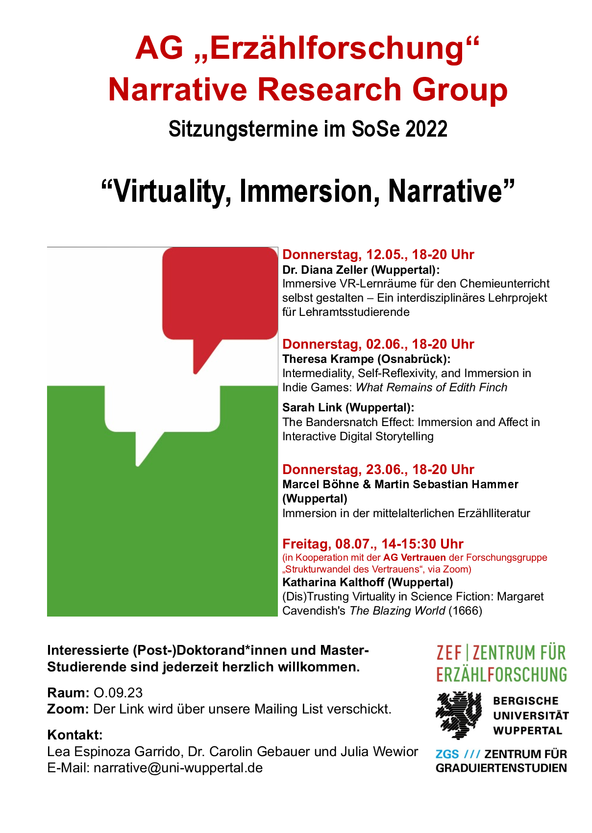 Die Arbeitsgruppe ›Erzählforschung‹ bietet (Post-)Doktorand:innen und Masterstudierenden die Möglichkeit, sich untereinander auszutauschen, eigene Ansätze, Ideen und Projekte vorzustellen und sie in einem kleinen Kreis zu diskutieren. Neben der Besprechung von laufenden Promotionen widmet sich die AG sowohl neueren narratologischen Publikationen als auch der Geschichte der Erzählforschung. Die Lektüre von ›Klassikern‹ der Erzählforschung einerseits sowie von literarischen Texten anderseits bringt Theorie und Praxis reflektierend zusammen. Damit trägt die AG als Diskussionsforum zur Vernetzung von narratologisch arbeitenden Wissenschaftler:innen der Bergischen Universität Wuppertal bei. Sie fungiert des Weiteren als Bindeglied zwischen dem Zentrum für Graduiertenstudien (ZGS) und dem Zentrum für Erzählforschung (ZEF) und assoziierten Institutionen.